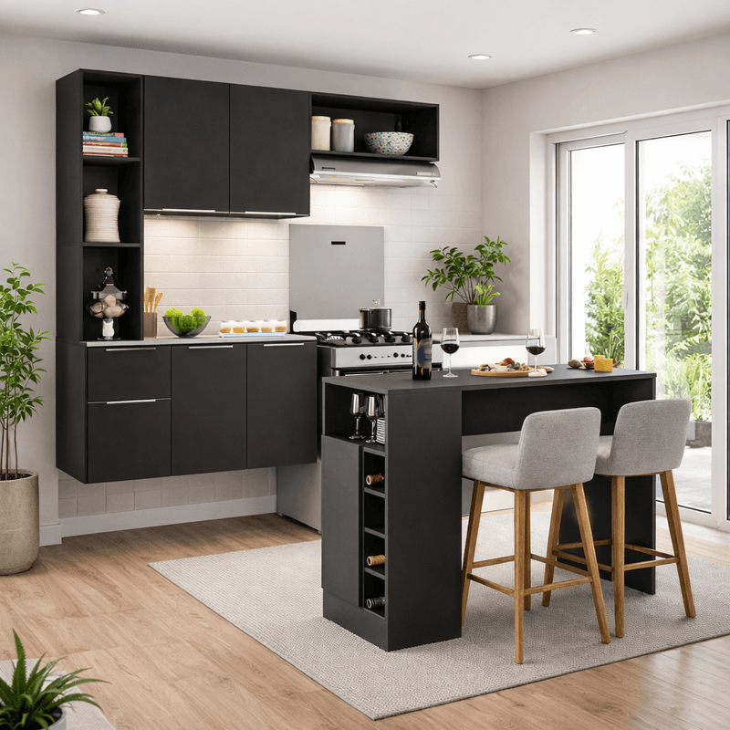 Produzido em MDP com acabamento acetinado (cerca de 20% de brilho), o Armário de Cozinha com Bancada Americana/Mesa Gourmet Sofia Multimóveis MP2195 é ecologicamente correto e garante durabilidade. Com amplo espaço interno para organizar seus itens, a cozinha conta com 5 portas (sendo a menor basculante), prateleiras, 1 gaveta com corrediças metálicas (mais leveza no manuseio), além de puxadores modernos e estilosos em ABS. O nicho aéreo individual pode ser montado dos dois lados, proporcionando flexibilidade na montagem. Os tampos de 15mm do balcão (suporta até 10kg) e da bancada (suporta até 20kg) são resistentes. O balcão NÃO é indicado para utilização de pia. Por ser uma cozinha suspensa (não possui pés), ela permite ajuste de altura para encaixar geladeira ou fogão, tornando este conjunto ainda mais funcional. A bancada conta com 1 porta, prateleira interna e adega embutida, o que facilita na hora de servir bebidas às suas visitas, além de poder ser utilizada também como divisora de ambientes. Com seu design inteligente, este conjunto é a escolha perfeita para transformar a sua área gastronômica num espaço elegante.