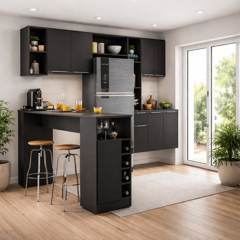 Produzido em MDP com acabamento acetinado (cerca de 20% de brilho), o Armário de Cozinha Suspensa com Bancada Americana Sofia Multimóveis MP2198 é ecologicamente correto e garante durabilidade. Com amplo espaço interno para organizar seus itens, a cozinha conta com 5 portas (sendo a menor basculante), prateleiras, 1 gaveta com corrediças metálicas (mais leveza no manuseio), além de puxadores modernos e estilosos em ABS. O nicho aéreo individual pode ser montado dos dois lados, proporcionando flexibilidade na montagem. Os tampos de 15mm do balcão (suporta até 10kg) e da bancada (suporta até 20kg) são resistentes. O balcão NÃO é indicado para utilização de pia. Por ser uma cozinha suspensa (não possui pés), ela permite ajuste de altura para encaixar geladeira ou fogão, tornando este conjunto ainda mais funcional. A bancada conta com 1 porta, prateleira interna e adega embutida, o que facilita na hora de servir bebidas às suas visitas, além de poder ser utilizada também como divisora de ambientes. Este conjunto é a escolha perfeita para transformar a sua área gastronômica num espaço sofisticado.