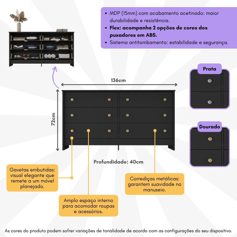 Descubra a perfeita combinação entre elegância e praticidade com a Cômoda 136cm com 6 Gavetas Flex Multimóveis MP4275. Produzida em MDP de 15mm com acabamento acetinado (cerca de 20% de brilho), esta cômoda garante durabilidade e resistência. Com 6 gavetas de corrediças metálicas que suportam até 3kg em cada, você terá leveza no manuseio e amplo espaço interno para acomodar roupas e acessórios. O tampo suporta até 17kg e permite incrementar o quarto com objetos decorativos. Os puxadores em ABS, com design redondo e delicado, adicionam um toque especial de charme, enquanto as gavetas embutidas remetem a um móvel planejado, proporcionando uma organização perfeita sem abrir mão de um estilo sofisticado. Além disso, o móvel acompanha 2 opções de cores de puxador (prata e dourado), para escolher, na hora da montagem, a que melhor combina com a decoração do ambiente.