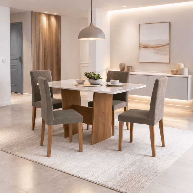 Deixe seus encontros ao redor da mesa ainda mais inesquecíveis com o Conjunto Mesa de Jantar 137cm com 4 Cadeiras Multimóveis CR50210. Combinando beleza, conforto e resistência, ele transforma sua sala de jantar em um espaço elegante e acolhedor, perfeito para compartilhar bons momentos em família e receber quem você ama com estilo.