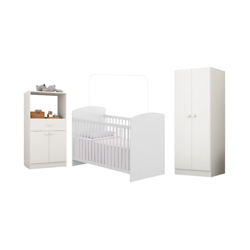 O guarda-roupa possui 2 portas e cabideiro que suporta até 3 kg de roupas longas e curtas, enquanto a cômoda conta com 2 portas, amplo nicho e gaveta com corrediças metálicas. Com eles, você poderá acomodar todas as roupinhas, brinquedos e acessórios do bebê. Os puxadores redondos em ABS dão o toque final de delicadeza no quartinho.